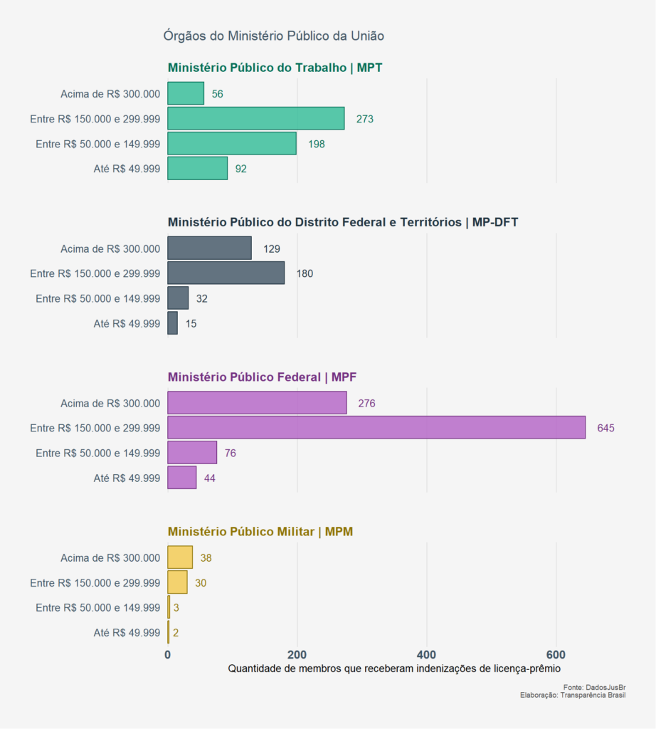 Considerando todos os órgãos do MPU, apenas 363 membros não venderam licença-prêmio ao menos uma vez. O MPF, maior órgão do MPU, soma R$ 241 milhões em repasses do benefício convertido em indenização para membros em exercício. Só em 2020 foram R$ 80 milhões a procuradores e promotores, somando ativos e inativos.