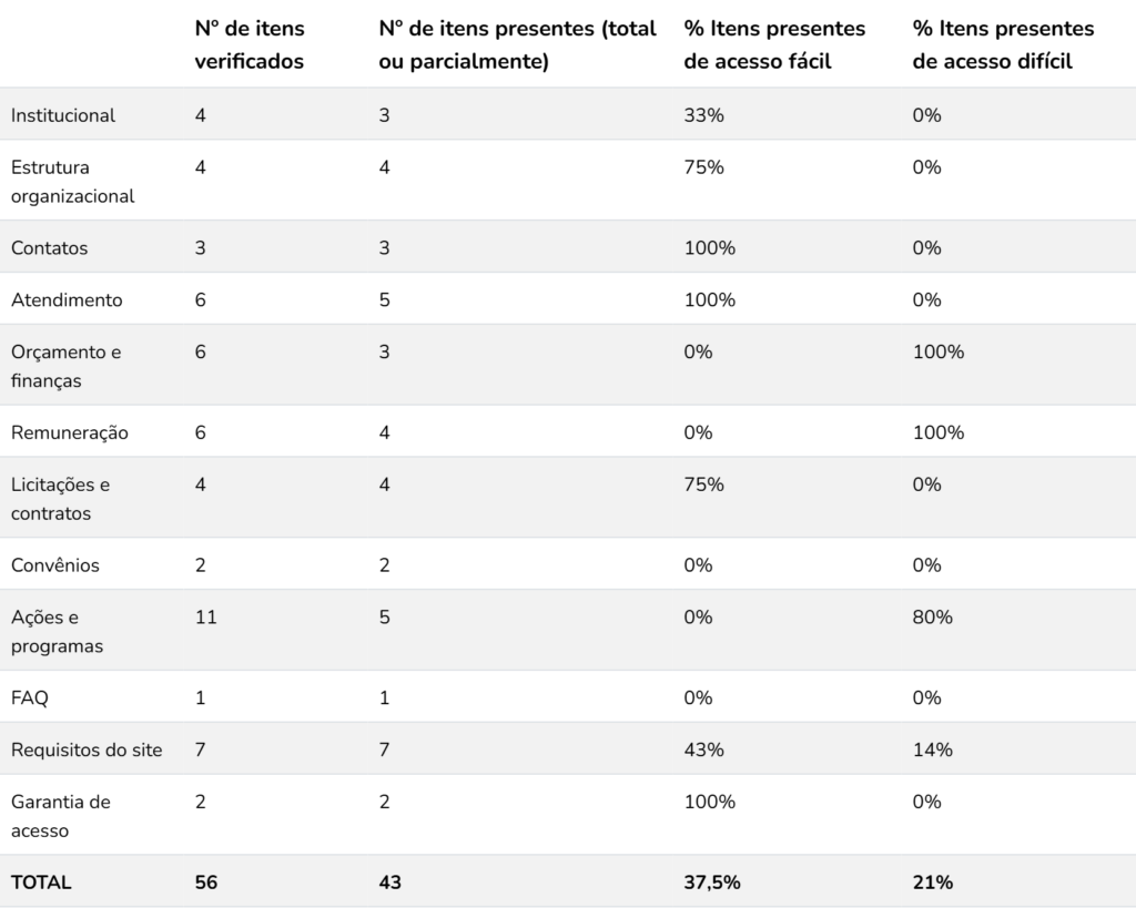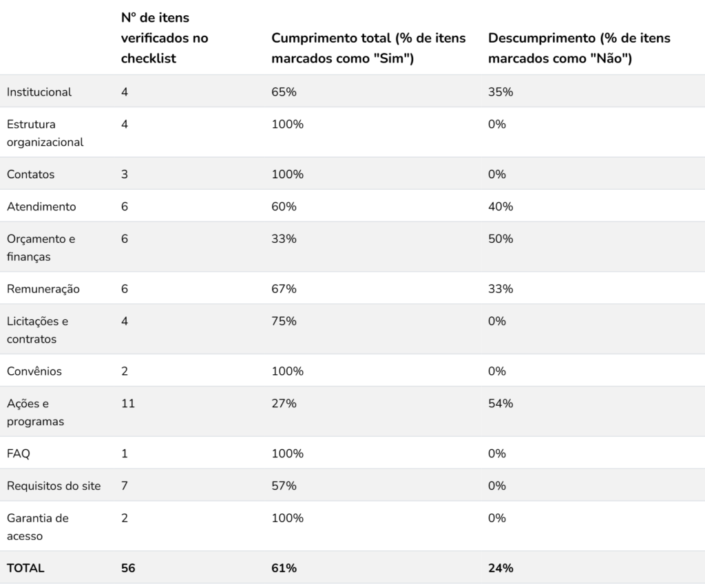 O objetivo do Checklist é oferecer à sociedade civil e às próprias defensorias uma forma de avaliar o nível de transparência das entidades na esfera digital e identificar de forma precisa os espaços para melhorias. São 56 itens na lista, agrupados em 12 categorias.