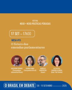 No dia 17.set, às 17h, a diretora-executiva da TB, Juliana Sakai, será uma das palestrantes do painel “O Futuro das Emendas Parlamentares”, que compõe a quarta edição do Festival Nexo + Nexo Políticas Públicas 2025. O debate será transmitido gratuitamente no canal do jornal Nexo no YouTube.